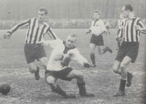 Ende der 30er Jahre: Wenn die Mannschaft auswärts spielte, stauten sich gegen Spielende in der Salzstraße die Massen vor dem Clublokal, mit Spannung auf das Ergebnis wartend und um Zeuge der telefonischen Zwischenberichte zu sein.